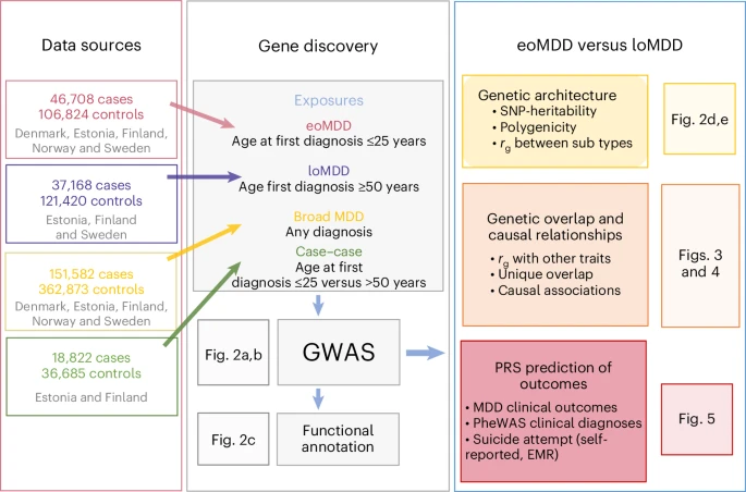 These findings suggest that eoMDD and loMDD have partially distinct genetic signatures, with a specific developmental brain signature for eoMDD. Importantly, we demonstrate that polygenic risk scores (PRS) for eoMDD predict suicide attempts within the first 10 years after the initial diagnosis: the absolute risk for suicide attempt was 26% in the top PRS decile, compared to 12% and 20% in the bottom decile and the intermediate group, respectively. Taken together, our findings can inform precision psychiatry approaches for MDD. Reference: John R. Shorter et al, Nature Genetics (2025)